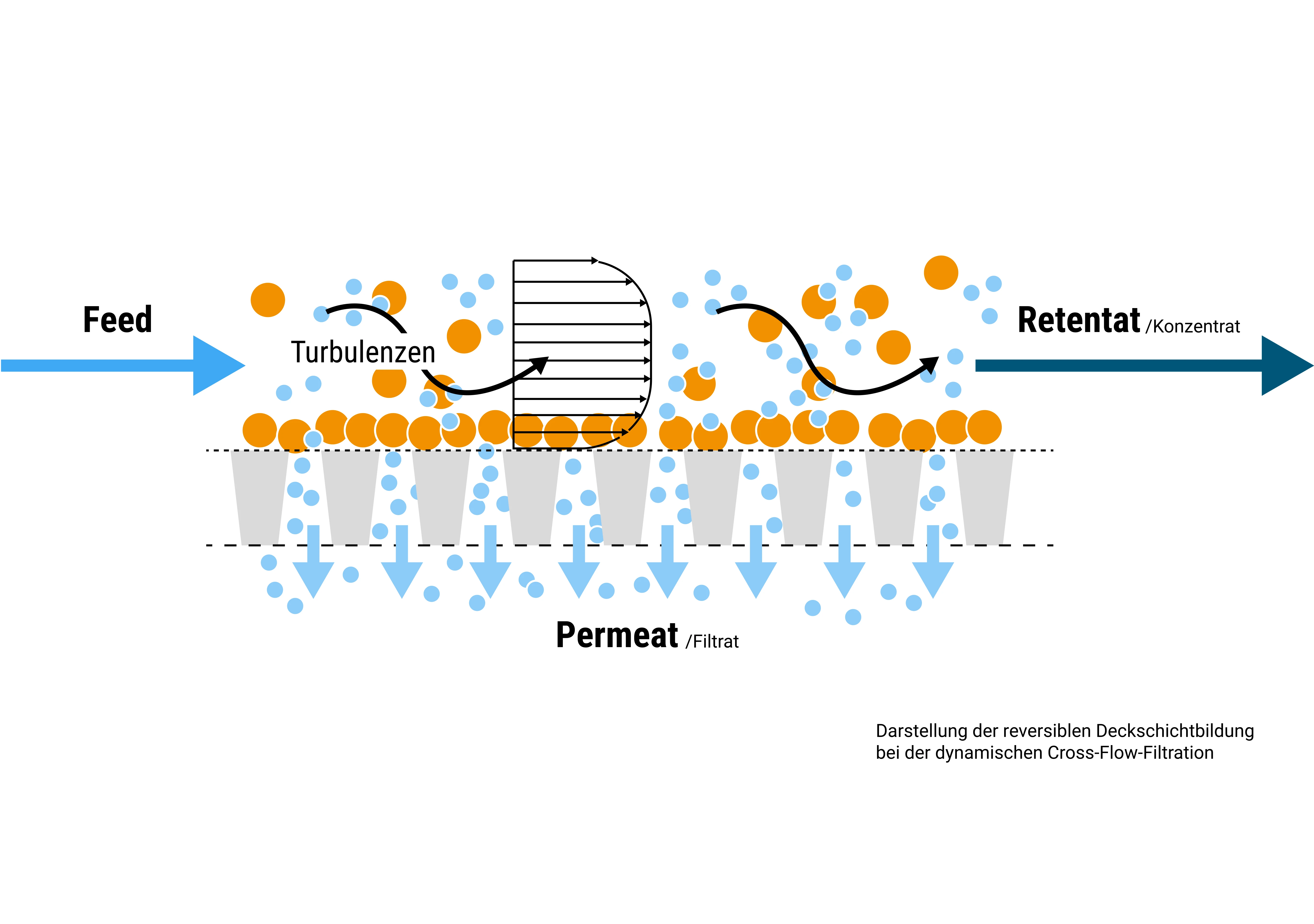 Die Filtration trennt den Prozessstrom Feed in Retentat/Konzentrat und Permeat/Filtrat. Die Trenngrenze – Partikel- bzw. Molekülgröße wird maßgeblich durch die Porengröße der Membran bestimmt. Bei der Filtration kommt es häufig zu Ablagerungen von Partikeln auf der Oberfläche der Membran. Diese Ablagerungen bilden eine Deckschicht, die den Durchfluss durch die Membran verringert und somit die Effizienz der Filtration beeinflusst. Durch Einstellen der Betriebsparameter der Filtrationsanlage - Über- und Durchströmung der Feedseite - lassen sich abgelagerte Partikel aus der Deckschicht in die Kernströmung zurückführen und als Konzentrat abtransportieren. Somit lässt sich die Deckschichtbildung kontrollieren. Dies nennt sich auch als reversible Deckschichtbildung.
