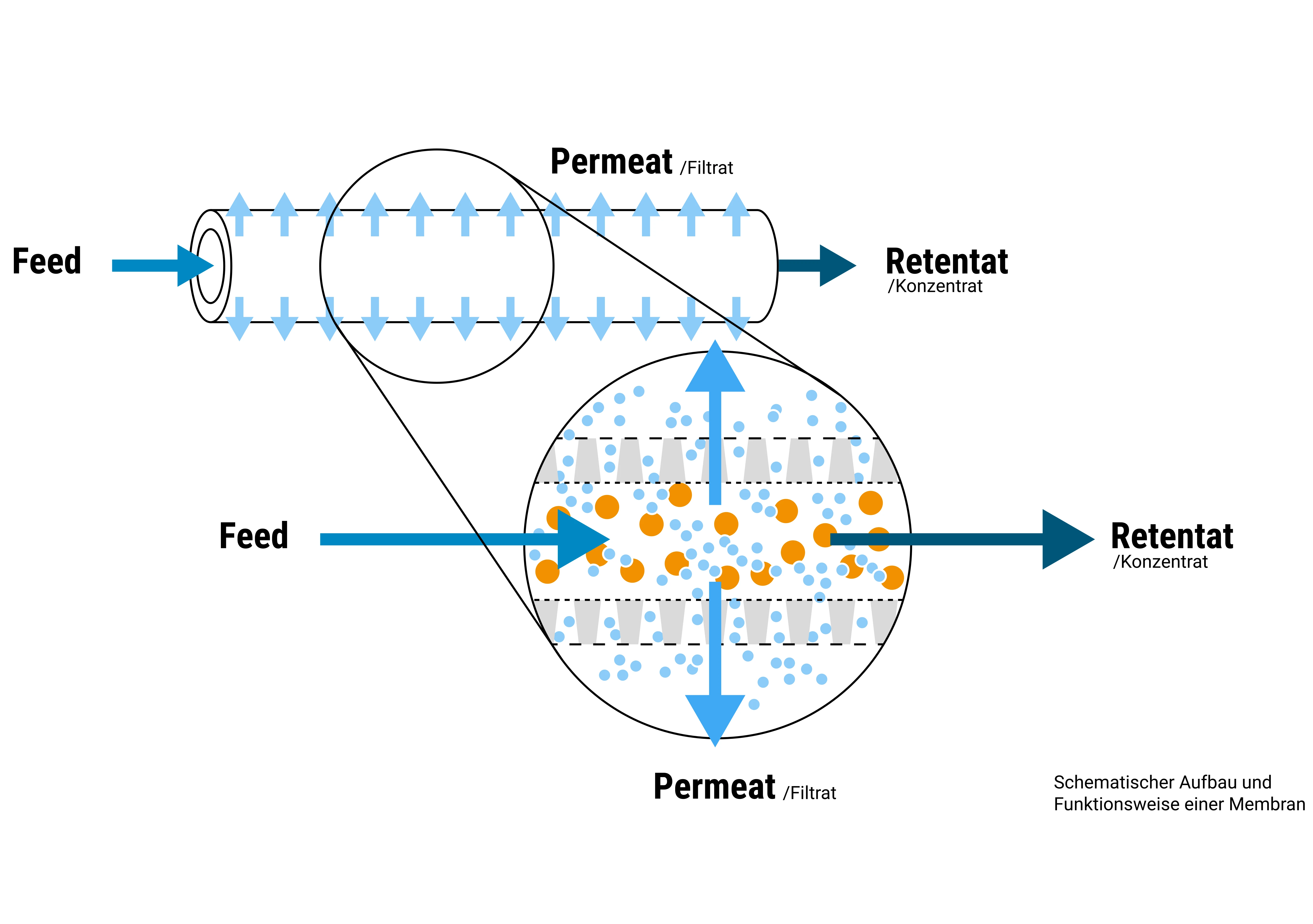 Das aufzutrennende Medium nennt sich „Feed“. Der Feedstrom fließt durch die Strömungskanäle/den Strömungskanal des Filtrationselements, dessen Struktur porös ist. Durch sie dringt das sogenannte „Permeat“ bzw. „Filtrat“ mit den durchgelassenen Bestandteilen auf die Permeatseite des Membranelements. Der mit der zurückgehaltenen Komponente angereicherte Feedstrom wird dadurch aufkonzentriert. Danach trägt er die Bezeichnung „Retentat“ (Konzentrat).