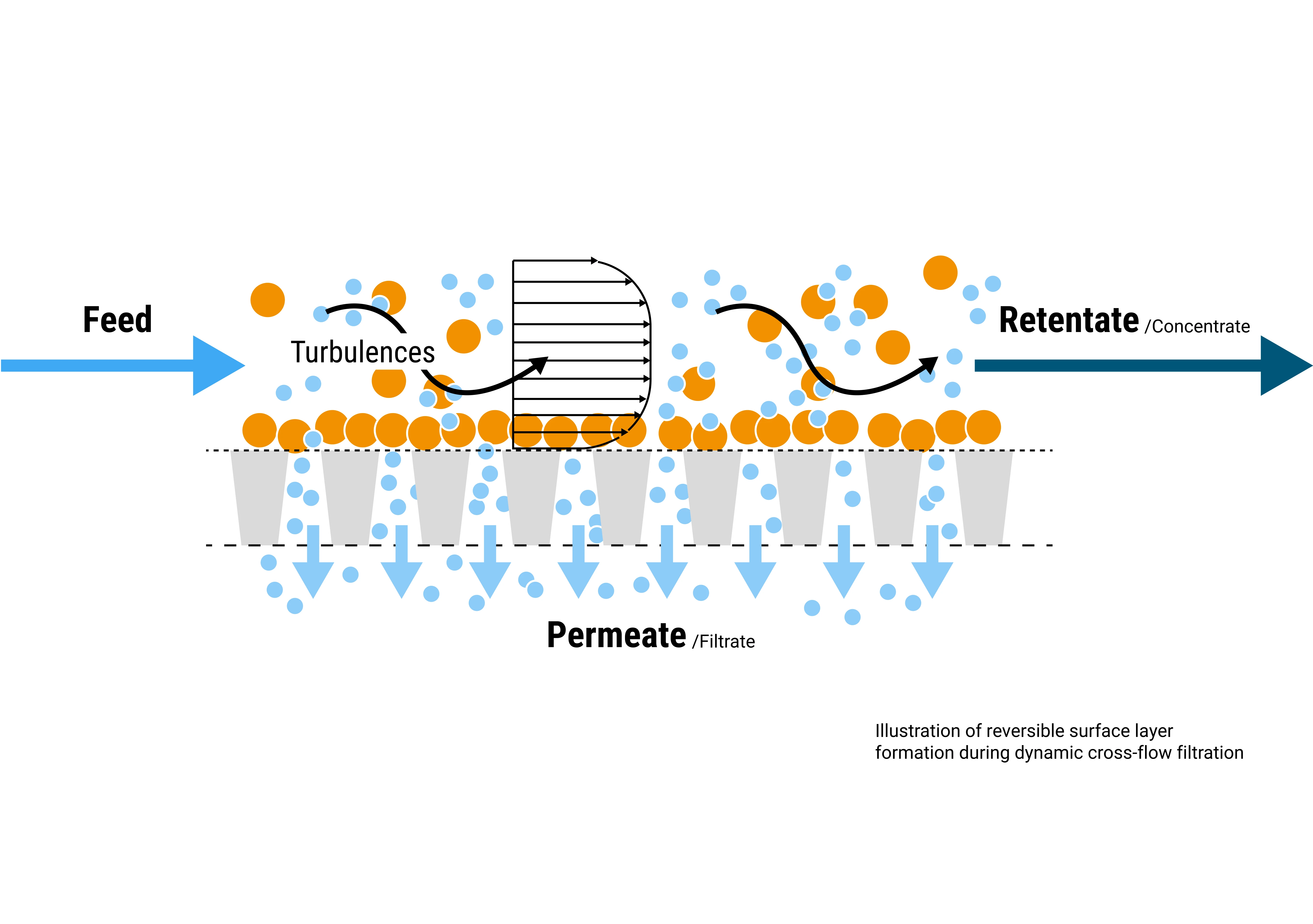 Filtration separates the process stream feed into retentate/concentrate and permeate/filtrate. The separation limit—particle or molecule size—is largely determined by the pore size of the membrane. During filtration, particles often accumulate on the surface of the membrane. These deposits form a coating that reduces the flow through the membrane and thus affects the efficiency of filtration. By adjusting the operating parameters of the filtration system – overflow and flow through the feed side – deposited particles can be returned from the cover layer to the core flow and removed as concentrate. This allows the formation of the surface layer to be controlled. This is also known as reversible surface layer formation.