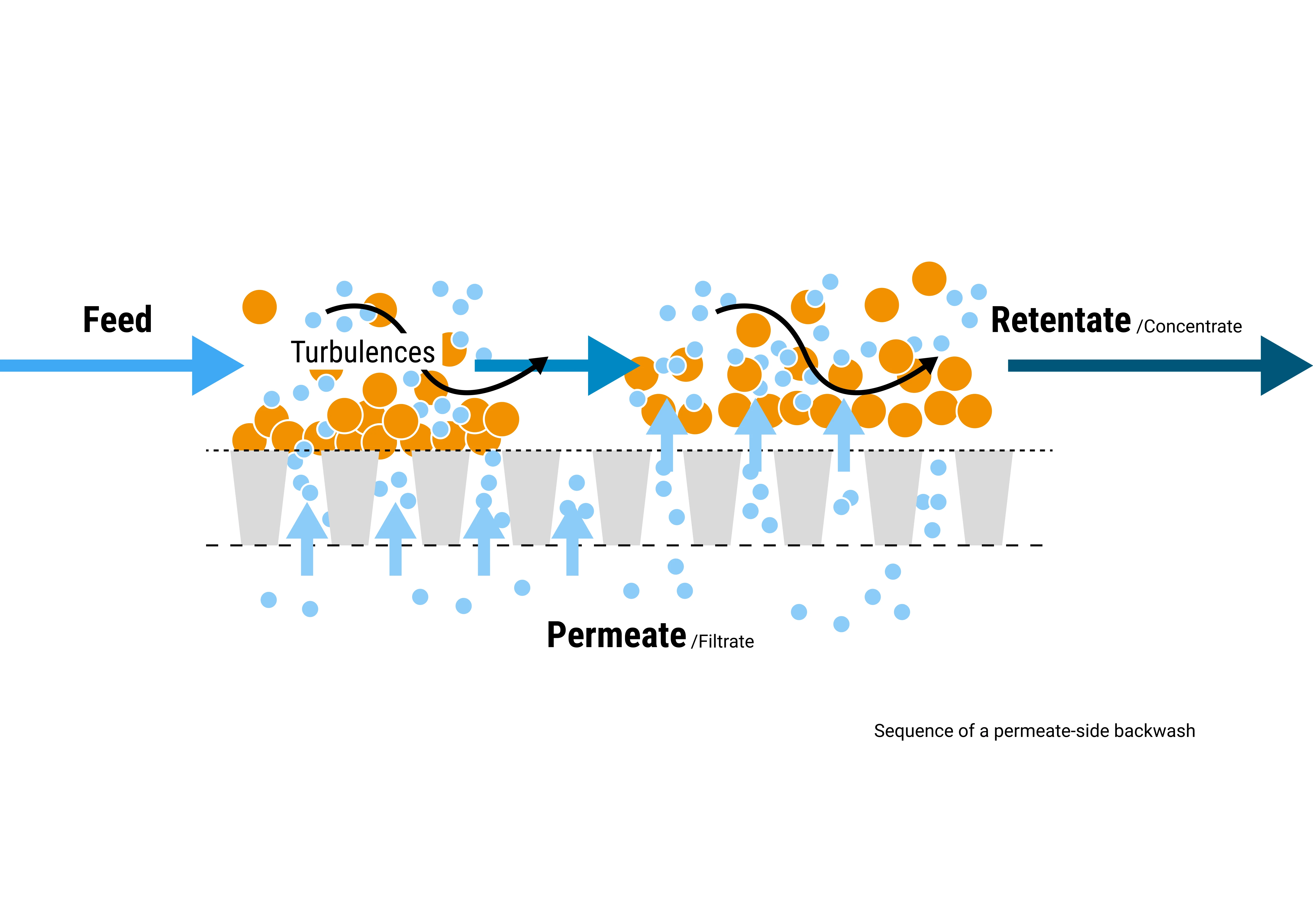 If the layer that forms still blocks the flow, it can also be removed. Backwashing can be used to remove the surface layer. This works by briefly reversing the filtration process. Pressure is applied to the permeate side at high overflow. The surface layer lifts off the membrane and is carried away by the overflow. Continuous flow can be achieved by repeating the backwashing cycle.