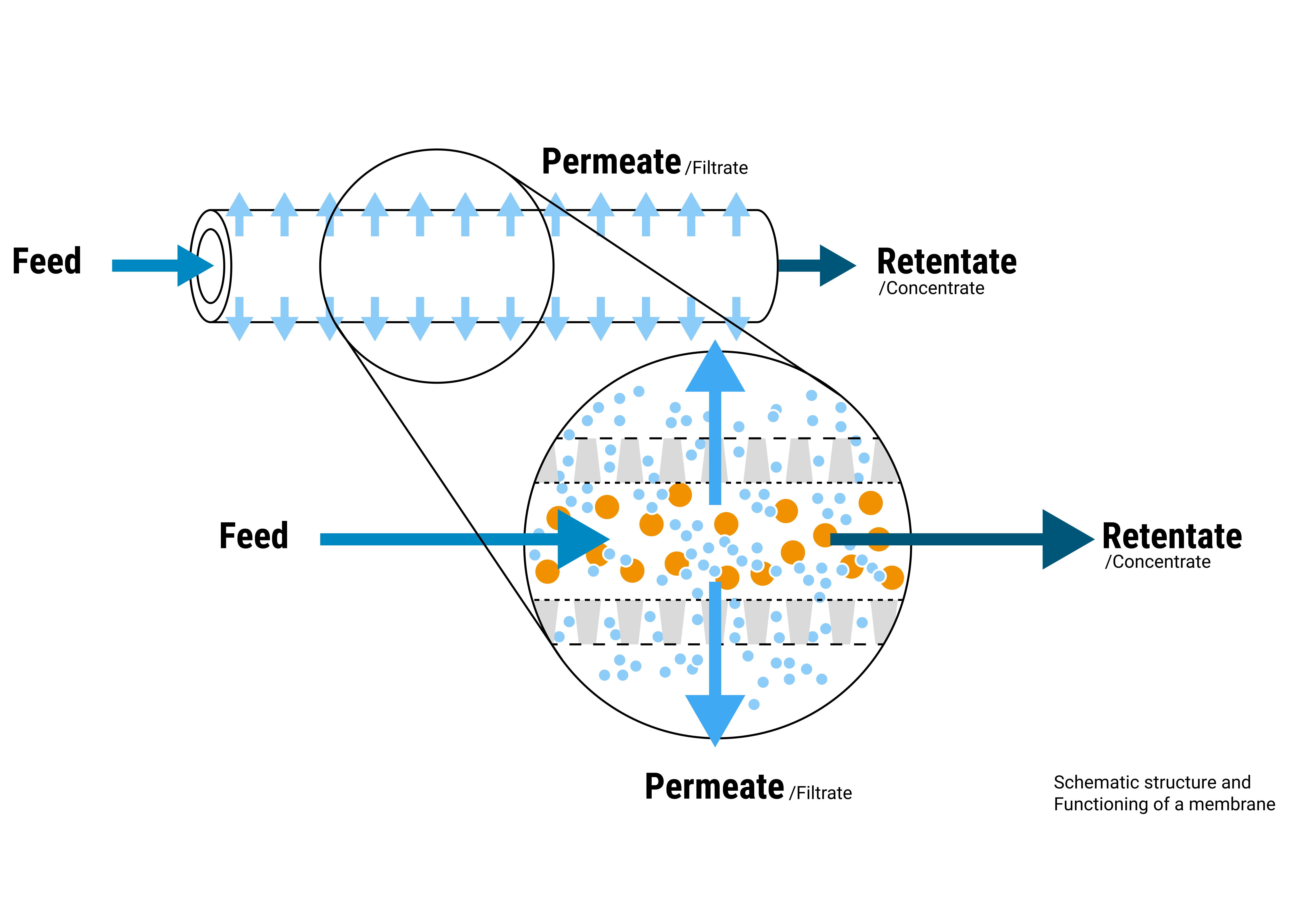 Filtration separates the process stream feed into retentate/concentrate and permeate/filtrate. The separation limit—particle or molecule size—is largely determined by the pore size of the membrane. During filtration, particles often accumulate on the surface of the membrane. These deposits form a coating that reduces the flow through the membrane and thus affects the efficiency of filtration. By adjusting the operating parameters of the filtration system – overflow and flow through the feed side – deposited particles can be returned from the cover layer to the core flow and removed as concentrate. This allows the formation of the surface layer to be controlled. This is also known as reversible surface layer formation.